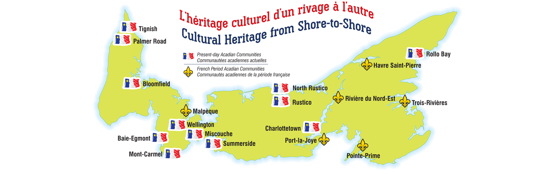 The Exploring Acadian Communities Past and Present map presents a self-guided itinerary of the 18 most noteworthy Acadian heritage places on Prince Edward Island. The map is accompanied by a total of 18 articles, all corresponding to the map, describing why each is significant (authored by Prince Edward Island Acadian scholar Georges Arsenault).